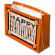 Uma bolsa de presente de aniversário feliz ousada para dar aos amigos ou à família. Este Laranja Geométrico Deco Happy Birthday Gift Bag tem três tons de laranja e preto.