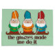 Os gnomos fizeram-me fazê-la. 3 gnomos coloridos diferentes que penduram para fora. A paródia/paródia do diabo fez-me fazê-la. 3 imagens do gnomo. Fundo do verde/turquesa. Inteiramente customizável.