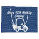 Carrinho de golfe branco fofo com tacos, saudação personalizada de Feliz Aniversário (ou o que você quiser que diga) em um fundo azul escuro com um padrão de diamante em sobreposição branca. Perfeito para aniversário, dia dos pais, despedida de solteiro ou presente para padrinhos.