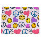 Paz, Amor, Ria, Sorria, Viva, Padrão. Com corações cor-de-rosa e roxo, faces amarelas sorridentes e felizes, e símbolo azul de sinal de paz com um fundo rosa claro. Ajudando-o a ficar alegre, motivado, encorajador, inspiração, a ter um excelente de dia. Circule-se com positividade. Excelente para crianças, meninas, melhores amigos, esposa, namorada, irmãs, tia, avós, mães, filhos e muito mais.