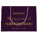 Saco de presente de padrinho de casamento personalizado com paleta de cor roxa e dourada. O nome modelo está pronto para você adicionar o nome do padrinho de casamento, bem como os nomes da noiva e do noivo e a data do casamento. A obrigado que você escreve diz "Obrigado por ser meu padrinho de casamento" em uma mistura de escrituras elegantes e tipografia forte e ousada. Procure na nossa loja cores e tamanho do alternativo.