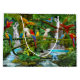Uma floresta húmida tropical com cachoeiras e folha bonitas da selva fornece um santuário seguro para estes papagaios coloridos no paraíso. A foto realística, esta pintura a óleo digital acentua as melhores imagens da natureza de nossos amigos emplumados.