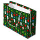 Enrole seus presentes com esta adorável bolsa de presente de Natal verde com Papai Noel, boneco de neve, presentes, doces, árvores de Natal, ornamentos e padrões de neve.