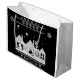 Esta ilustração original de natal do pai feliz neste saco de natal personalizável foi desenhada em caneta e tinta. A ilustração de natal preto e branco mostra um papai noel bonito carregando seu saco no telhado coberto de neve. Papais noeis realmente se destacam contra o céu estrelado enquanto ele entrega seus presentes de natal. Uma árvore de natal decorada está na janela central e uma estrela grande brilha no céu noturno. Olhar pelas cortinas em outra janela é uma garotinha aguardando ansiosamente a visita dos papais noeis. Esta bolsa de presente de natal de Natal de conteúdo preto e branco é personalizável para você personalizá-la com seu próprio texto. Este desenho de papais noeis faz parte de uma coleção de quatro ilustrações de caneta preto-e-branco e de natal de tinta.