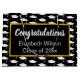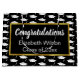 Um padrão de bonés de formatura brancos aparece nesta bolsa de presente de graduação negra. No centro, há um retângulo preto com uma borda de ouro falsa (não em folha). Dentro no retângulo, há a mensagem 'Parabéns em um script branco e texto branco que podem ser personalizados com o nome do formando e o ano da classe.