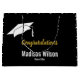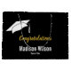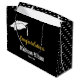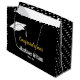 Um boné formando está acima de um texto de exibição dourado que diz 'Parabéns. Na parte inferior, há duas linhas de texto branco para o nome do formando e o ano em que o aluno se forma. Um padrão de bonés brancos de formando está nas laterais deste saco de presente preto.