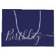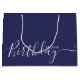 Este grande saco de presentes apresenta uma elegante tipografia de Feliz Aniversário em branco sobre fundo azul marinho.