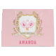 Encerre seu presente com esta linda bolsa de presente de aniversário de picleball personalizada. Este design tem uma imagem aquosa de uma crista rodeada por galhos com pás-de-piclebol cor-de-rosa-gingham no centro. O texto diz "Parabéns." As cores utilizadas incluem verde-musgo, rosa-pincel e bronzeado. Você pode personalizar com um nome e o ano de aniversário.