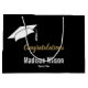 Um boné do formando está acima do nome customizável do formando no texto branco em um fundo preto. O texto do ouro do falso diz "parabéns. Você pode personalizar a classe de ano.