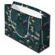 Este elegante teal de pavões florais e flores de Magnolia grande saco de presentes apresenta pavões azuis e lacrimogêneos feitos à mão nos galhos das árvores da Magnolia em flor no padrão do estilo da Chinoiserie. Tudo contra um elegante fundo negro com silhueta floral detalhando.