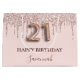 Elegante, clássico, glamouroso e feminino para uma festa de aniversário de 21 anos. Um fundo cor-de-rosa pincelado. Decorado com pingos de brilho sujo rosa, aparência de pingar tinta. Personalize e adicione um nome. Com o texto: Parabéns. O nome é escrito com um moderno estilo escrito à mão. O número 21 é escrito com uma fonte no estilo do balão.