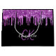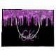 Um elegante fundo preto decorado com pingos de purpurina falsa roxa e rosa, aparência de tinta pingando. Personalize e adicione uma data, nome e idade. Um estilo moderno de letra manuscrita, letras roxas. Perfeito para embrulhar presentes ou lembrancinhas para festas de aniversário, chá de noiva e chá de bebê.