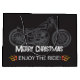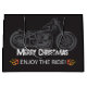 Motocicleta Feliz Natal com silhueta de moto vintage em cinzas sobre fundo preto. "Aproveite a Corrida!" com chamas embaixo.