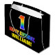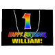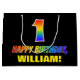 Este design de bolsa de presente divertida, alegre e colorida de aniversário apresenta um grande número "1" e a mensagem "FELIZ ANIVERSÁRIO", ambos tendo um gradiente de padrão inspirado no espectro do arco-íris, juntamente com um nome ousado de destinatário personalizado amarelo. O fundo é preto colorido. Uma bolsa de presente de aniversário divertida como esta pode ser usada para embrulhar um presente ou presente para alguém que comemora seu primeiro aniversario. [~Z0000477]