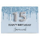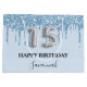 Elegante, clássico, glamouroso e feminino para uma Quinceañera, 15 festa de aniversário. Um bebê azul-tenente, fundo azul-claro. Decorado com pingos de brilho sujo, aparência de pingar tinta. Personalize e adicione um nome. Com o texto: Parabéns. O nome é escrito com um moderno estilo escrito à mão. O número 15 é escrito com uma fonte no estilo do balão.