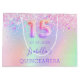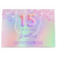Um saco de presente para uma Quinceañera, menina glamourosa e giro, 15. Um fundo holográfico em rosa, roxo e verde-menta com confete. O número 15 é escrito com uma fonte no estilo do balão. Perfeito como um saco de favores ou como um saco de presentes.