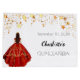 Um fundo branco decorado com estrelas e uma garota vestindo uma tiara e um vestido vermelho. Personalizar e adicionar nome, data.
