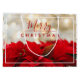 Um grande saco de presentes com uma fotografia festiva de férias com um buquê de poinsetos vermelhos no fundo. Luzes de anzol do ouro em segundo plano. Estilo sofisticado clássico. Uma tipografia feliz de Natal escrita em uma fonte vermelha de tendência.