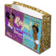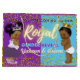 Adorável príncipe africano com coroa dourada, fralda branca e chinelos azuis ao lado de uma bela princesa africana em afro-punhos vestindo um vestido de tutu roxo e um diamante brilhante tiara. Fundo do bloco de cor roxo e azul. Shimmering dourado brilhando confete brilho. Personalize com seu próprio texto. ©2021 Designs do Partido Sassy