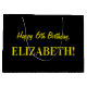 Um lado deste simples e divertido design de presente de aniversário com o tema de aniversário tem um grande número "6" com um padrão cor-de-rosa escuro e listras de rosa claro. O outro lado tem a mensagem de saudação de aniversário "Parabéns ao 6 de Aniversário", e um nome editável, ambos em texto amarelo. O fundo é preto colorido. Um saco de presentes como este pode ser usado ao embrulhar presentes ou presentes sendo dados a alguém que comemora seu sexto aniversário. [~Z0000378]