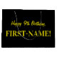 Um lado deste design de saco-presente com tema de aniversário simples e divertido tem um grande número "9" com um padrão cor-de-rosa escuro e listras de rosa claro. O outro lado tem a mensagem de saudação de aniversário "Happy 9th Birthday", e um nome editável, ambos em texto amarelo. O fundo é preto colorido. Sacos de presentes como este podem ser usados para embrulhar presentes ou presentes para celebrar o nono aniversário de alguém. [~Z0000378]