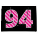 Um lado deste simples e divertido design de saco-presente com tema de aniversário tem um grande número "94" com um padrão cor-de-rosa escuro e listras de rosa claro. A mensagem de saudação de aniversário "Happy 94th Birthday" e um nome personalizável aparecem no outro lado, ambos em texto amarelo. O fundo tem uma coloração preta. Um saco de presentes como este pode ser usado quando se embrulham presentes ou presentes para celebrar o 90.º aniversário de alguém. [~Z0000378]