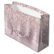Saco de presente personalizado com monograma em Glitter Rosa Dourado Metalizado Glamour Feminino. Este design apresenta seu primeiro nome em uma linda tipografia de letra manuscrita com cauda swash (ou caligrafia) em folha metálica cor de rosa dourado falsa com brilho glamouroso e borda glitter. São fáceis de personalizar. Esta bolsa de presente feminina é ótima para presente de casa nova, também para aniversário, dia das mães, casamento, festa de 16 anos, chá de noiva, chá de bebê, presente de festa de formatura e é para a garota que ama coisas únicas e estilosas com brilho.