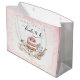Eleve a apresentação do chá de noiva com esta elegante bolsa de presente Noiva em Espera, projetada com tons suaves de rosa, detalhes em dourado e uma cena de chá inspirada no vintage. Perfeita para brindes de festa, pequenos presentes ou surpresas para a noiva, esta bolsa combina sem esforço com o tema romântico do chá de noiva.