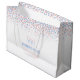 Mostre seu apreço aos seus assistentes de casamento com esta bolsa de presente de casamento da dama de honra. Perfeito para encher com um presente especial para mostrar seu apreço. Simples mala de bonificação gráfica de ponto confetti. Design de casamento moderno e fascinável parte do quartzo rosa e do conjunto de casamento de confetti azul de serenidade. Bonito tons pastéis de azul e rosa em uma cor de fundo branca. Personalize/personalize estas grandes bolsas de presentes com o nome dos seus próprios assistentes. Desenhada e projetada exclusivamente por Sarah Trett.