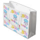 Esta bolsa de presente apresenta as palavras "Chá de Bebê" em uma fonte de impressão única com letras de cores diferentes com uma nuvem e gotas de chuva neste tema de estrelas e animais. Todas as bolsas de presente são feitas com papel de alta qualidade para extra durabilidade e sua escolha de acabamento fosco ou brilhante disponível em mais 3 tamanhos ótimos para chá de bebê, casamentos ou aniversários.