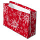 Saco de presente de Natal é mostrado em um impressão festivo flocos de neve de inverno. Vermelho colorido