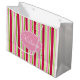 Listras coloridas cor-de-rosa, vermelha e verde decoram esta bolsa de presente. Personalize este saco de presentes fofo mudando o nome. Esta bolsa é excelente de aniversário, feriados, Natal, etc... A design é de arte original.
