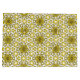 Padrão arabesco artificial caracterizado por motivos florais simétricos em preto, branco e amarelo. Cada motivo é constituído por uma flor central rodeada por formas semelhantes a pétalas, formando um arranjo circular. Elementos em forma de coração preenchem os espaços entre motivos. O design está sobre fundo branco, criando um contraste impressionante com o trabalho detalhado de linha. Esse estilo lembra a arte ornamental tradicional do Oriente Médio, enfatizando simetria e repetição.