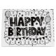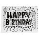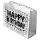 Uma bolsa de presente branca com letras pretas que diz "Feliz Aniversário" e vários desenhos pretos. A bolsa é feita de papel brilhante e tem alças de corda branca. A letra é negrita e estilizada, com cada letra preenchida com padrões diferentes, como estrelas, pontos e listras. Os desenhos incluem balões, estrelas, círculos e linhas onduladas, criando um design festivo e comemorativo. A bolsa está bem iluminada, destacando o contraste entre o fundo branco e os gráficos pretos.