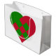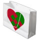 This large gift bag features the timeless Scandinavian Yule Heart (julehjerte) pattern - a beloved symbol of warmth and tradition in Nordic holiday customs. The classic red and green heart motif on crisp white background brings vintage Scandinavian style to modern gifting.