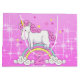 Um unicórnio giro se posiciona num arco-íris colorido num céu rosa e cintilante.