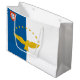A bandeira dos Açores calçado em frente e atrás deste grande saco-presente.