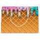 Sorvete rosa, roxo e verde-menta pingando em um cone de waffle com borrifadas pastel multicolorido.