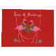 "Mares e saudações" tropicais flamingos Saco de presente de papel de Natal em grande escala. Cor vermelha de férias com aves cor-de-rosa vestindo mortes festivas e permanecendo entre estrelas-do-mar. O casal flamingo é impresso em ambos os lados sobre uma cor vermelha comum.