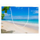Saco de presentes com uma fotografia adorável. Uma praia branca arenosa com água azul azure. Relaxando a imagem com um céu ensolarado e um surf espumante gentil com algumas folhas tropicais bonitinhas moldando a imagem.
