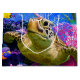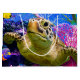 Linda tartaruga marinha nadando entre peixes tropicais perto de um recife colorido.