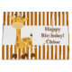 Fundo torrado de laranja e faixa branca. Grande banda branca no meio. Uma girafa de bebê longa distância na banda com texto personalizável. O modelo está certo para sua conveniência. Safari Giraffe gráfico Crédito Prettygrafik.com.