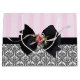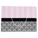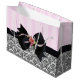 Saco de presente brilhante grande com imagem de listras cor-de-rosa na metade superior e design barroco francês preto e branco na metade inferior dividido por uma fita preta revestida com um arco preto com rosa rosa e detalhe de fita. Veja o saco de presentes médio correspondente. Veja toda a coleção Birthday Gift Bag nos TOUCHES ESPECIAIS | Seção Favoritos para festas.