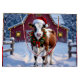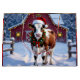 Saco de presente sazonal em estilo country de Natal, com ilustração de uma vaca festiva num chapéu de Papai Noel, em frente a um lindo celeiro vermelho, decorado em luzes de Natal e uma coroa festiva num dia de inverno de neve. O fundo é uma madeira de fundo ou de celeiro rústico.