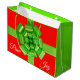 Verde limão com um saco de presentes de Arco em excesso Este tem o arco mais bonito. Fundo vermelho e letras brancas. Saco lindo.