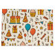 A bright and playful seamless pattern featuring a classic assortment of festive party icons. This joyful design utilizes a cheerful color palette of primary and warm tones (red, orange, yellow, and blue) set against a light background.