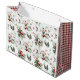 Este saco mostra folhagem verde da floresta com bagas vermelhas de amora-branca num fundo branco brilhante. Este padrão se coordena com a Coleção de Casamentos de Berry de inverno.