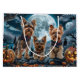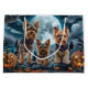 Libere o espírito assustador com esta design sombria do Dia das Bruxas apresentando um bando de cachorros sob um céu escuro e iluminado, cercado por morcegos voadores e abóboras brilhantes. Perfeito para aqueles que amam um toque de diversão terrível com seus amigos peludos!