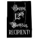 Este design de presente de aniversário de rico e ornamentado apresenta a mensagem "Feliz aniversário de 12", em um texto elaborado no estilo de script, em um fundo preto colorido. Ele também tem um nome de destinatário personalizável. Um saco de presentes temático de aniversário como este pode ser uma maneira respeitável de embrulhar um presente ou presente para celebrar o 12 de alguém. [~Z0000557]