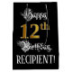 Este rico e elegante aniversário com o tema giftbag design apresenta a mensagem "Happy 12 Birthday", e um nome de destinatário editável. Parte da mensagem está em um texto estilo script do ornamentado, o grande número "12" apresenta um padrão de aparência falsa/imitado de inspiração dourada, e o fundo é preto colorido. Um saco-presente como este pode ser usado para dar um presente ou presente em honra do décimo segundo aniversário de alguém. [~Z0000560]